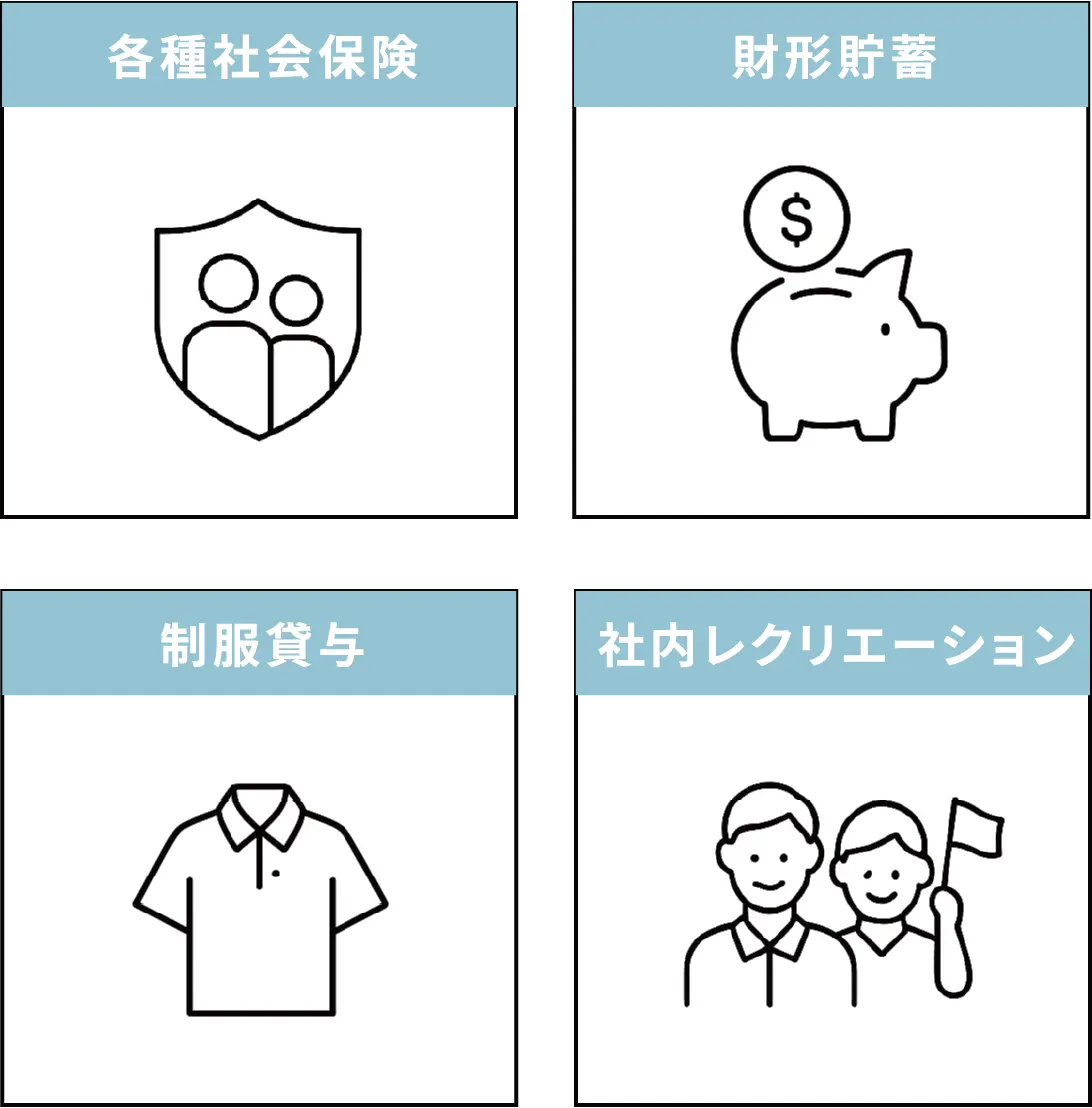 社会保険完備(健康保険、厚生年金、雇用保険、労災保険) 財形貯蓄制度 企業年金基金 定期健康診断 インフルエンザ予防接種補助 制服貸与 退職金制度