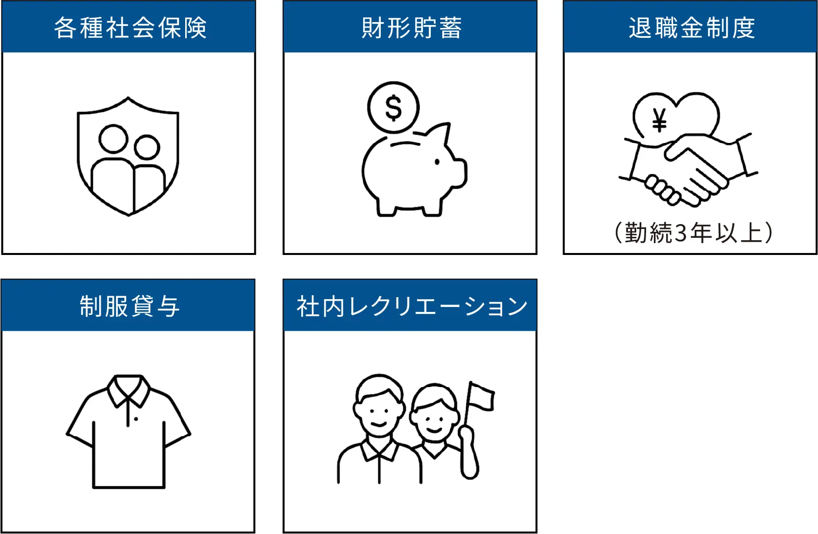 | 給与 | 大卒:219,000円 高卒:203,000円 ※既卒者の給与は、最終学歴に加え、これまでの経験や能力等を考慮し、当社規定に基づき決定します。 |
